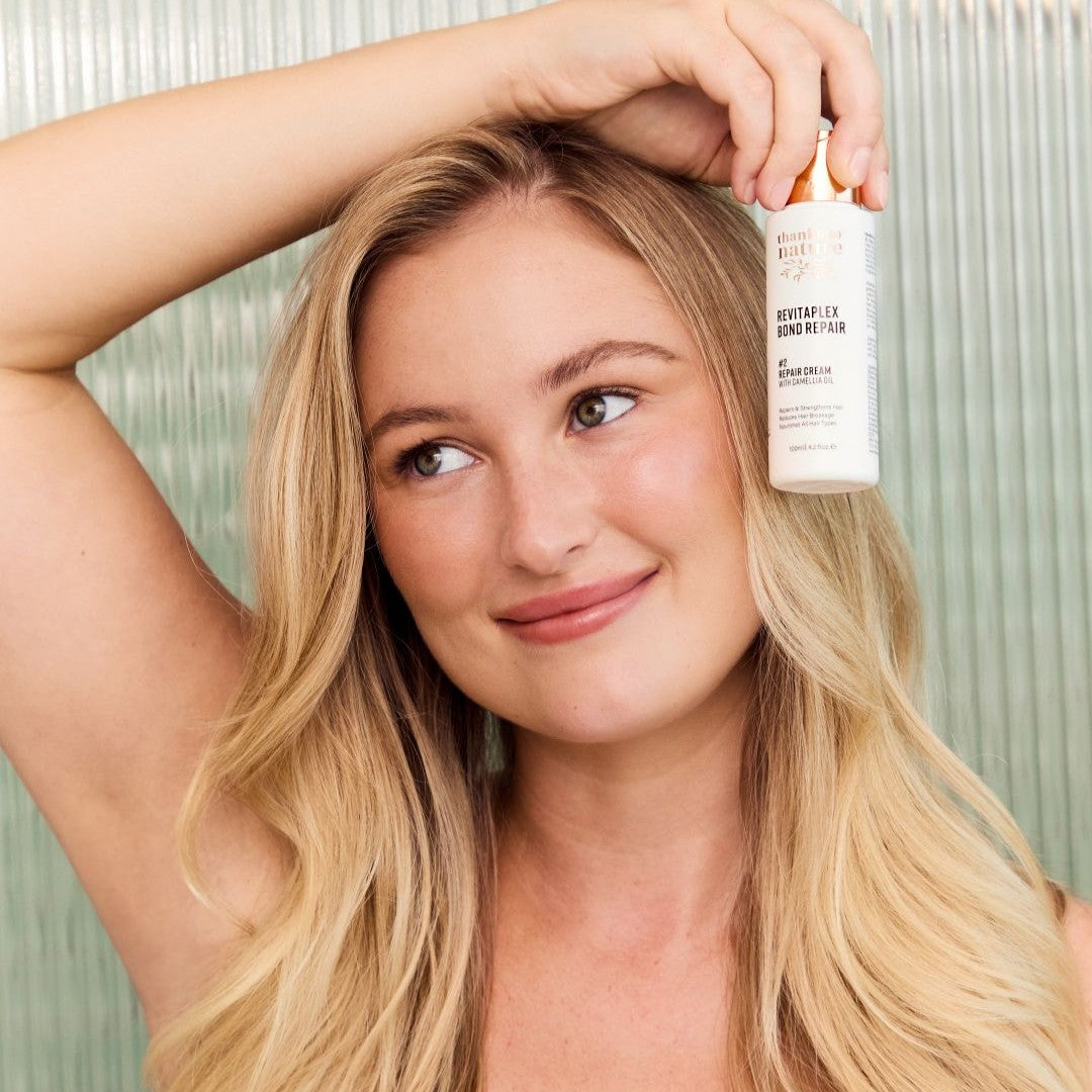 thanks to nature® RevitaPlex Bond Repair #2 Repair Cream is designed to repair and treat damage by reducing hair breakage and strengthening each strand. A concentrated treatment that repairs, protects and strengthens in minutes. lnnovative bond building technology restores hair's natural appearance and texture, achieving healthier hair with every use. Delicately fragranced to leave hair smelling beautiful.