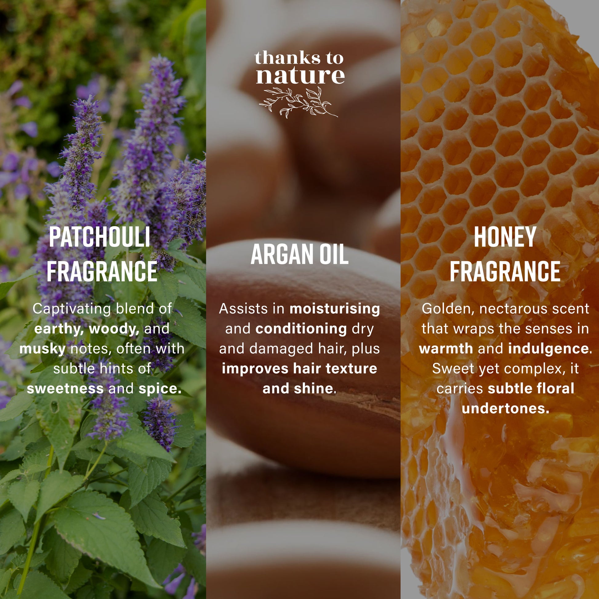 Fresh notes of our unique signature fragrance. A sparkling scent with vibrant notes of honey, patchouli and amber, plus added Argan Oil for shiny, beautifully perfumed hair.