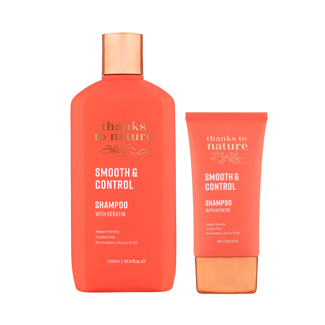 Smooth & Control Shampoo is an anti-frizz shampoo with vegan Keratin, Vitamin E, Panthenol and Wheat Protein that tames flyaways, reduces frizz and leaves hair smooth, glossy and manageable.